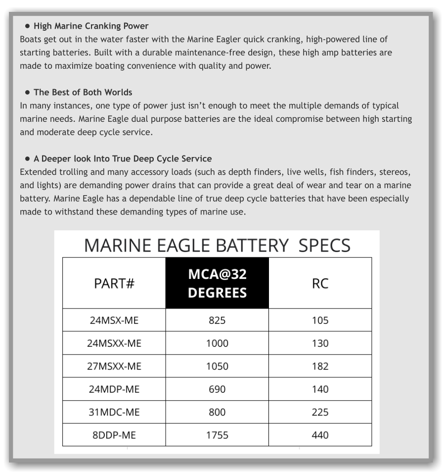 Click to Learn More MARINE POWER SPORTS COMMERCIAL AUTOMOBILE RECREATIONAL GOLF CART MUNICIPAL  FLEETS SOLAR POWER Awarded VEH114 State Wide Contract  Batteries, Motor Oils, Automotive Parts, Chemicals and Additives The WATER Is Waiting. The POWER Is Yours. STARTING        DUAL PURPOSE         HD DEEP CYCLE         AGM AGM Over 2X Cycle Life TM Deep Cycle  Starting  Maintenance Free  MARINE  AUTOMOTIVE  COMMERCIAL   FAST  LOCAL  SERVICE    •	No Tariff’s  •	Buy American  •	Includes Deka Heavy Duty Commercial Group 4D and 8D CALL FOR PRICING DETAILS
